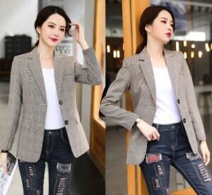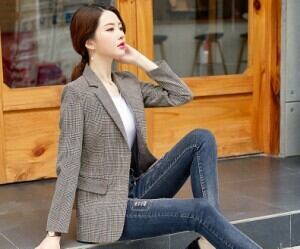 ブラウンのチェック柄のテーラードジャケットです。